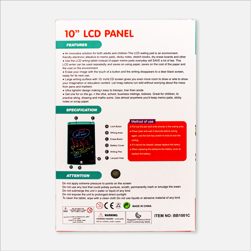 10 in LCD Panel Colorful Writing Tablet ITEM NO. BB1001C